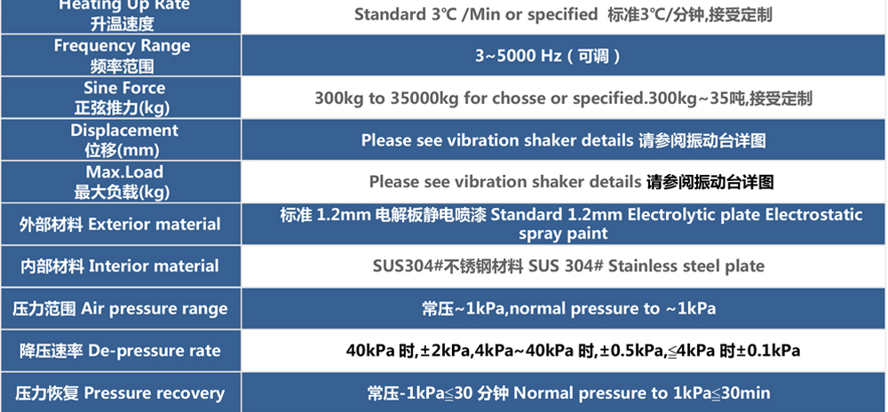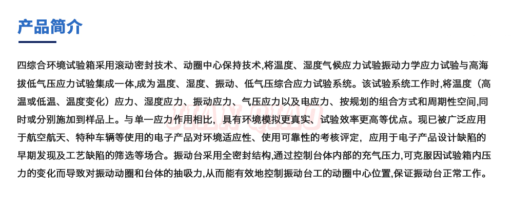 用途:四綜合環境試驗箱采用滾動密封技術、動圈中心保持技術,將溫度、濕度氣候應力試驗振動力學應力試驗與高海拔低氣壓應力試驗集成一體,成為溫度、濕度、振動、低氣壓綜合應力試驗系