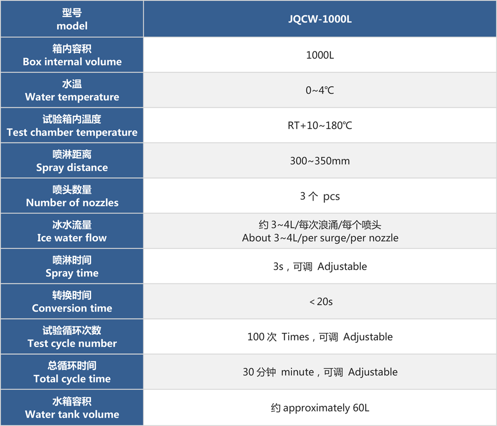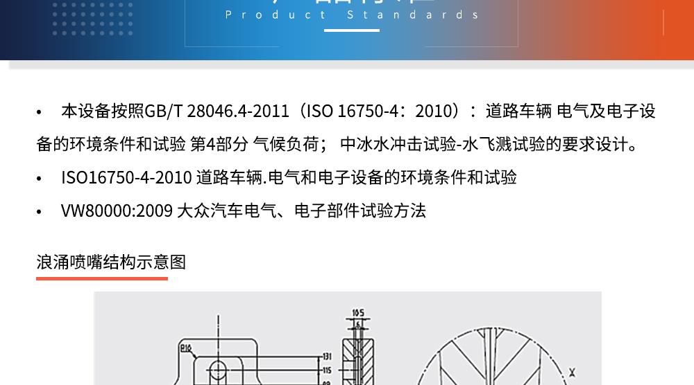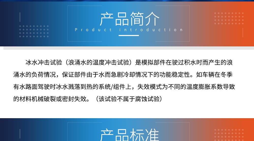 用途:冰水沖擊試驗(yàn)(浪涌水的溫度沖擊試驗(yàn))是模擬部件在駛過(guò)積水時(shí)而產(chǎn)生的浪涌水的負(fù)荷情況,保證部件由于水而急劇冷卻情況下的功能穩(wěn)定性。如車(chē)輛在冬季有水路面駕駛時(shí)冰水濺落到熱的系統(tǒng)/組件上,失效模式為不同的溫度膨脹系數(shù)導(dǎo)致的材料機(jī)械破裂或密封失效