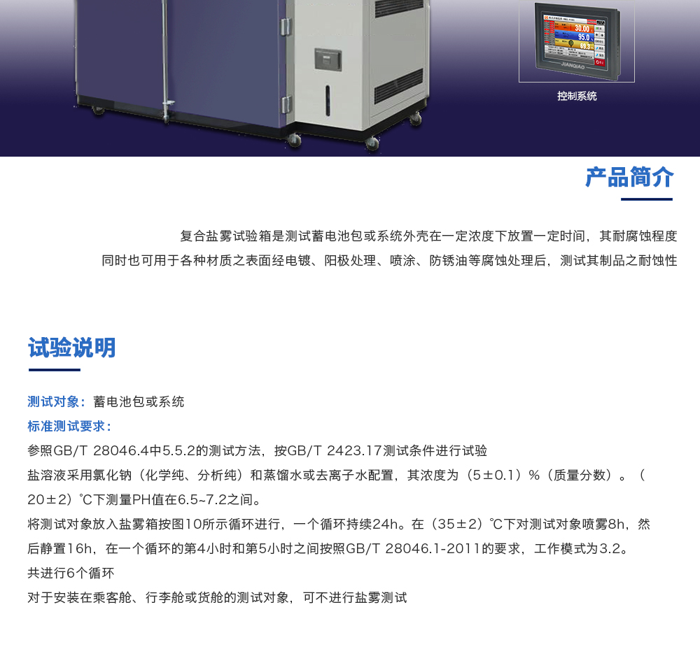 用途:復(fù)合鹽霧試驗(yàn)箱是測(cè)試蓄電池包或系統(tǒng)外殼在一定濃度下放置一定時(shí)間,其耐腐蝕程度同時(shí)也可用于各種材質(zhì)之表面經(jīng)電鍍、陽(yáng)極處理、噴涂、防銹油等腐蝕處理后,測(cè)試其制品之耐蝕
