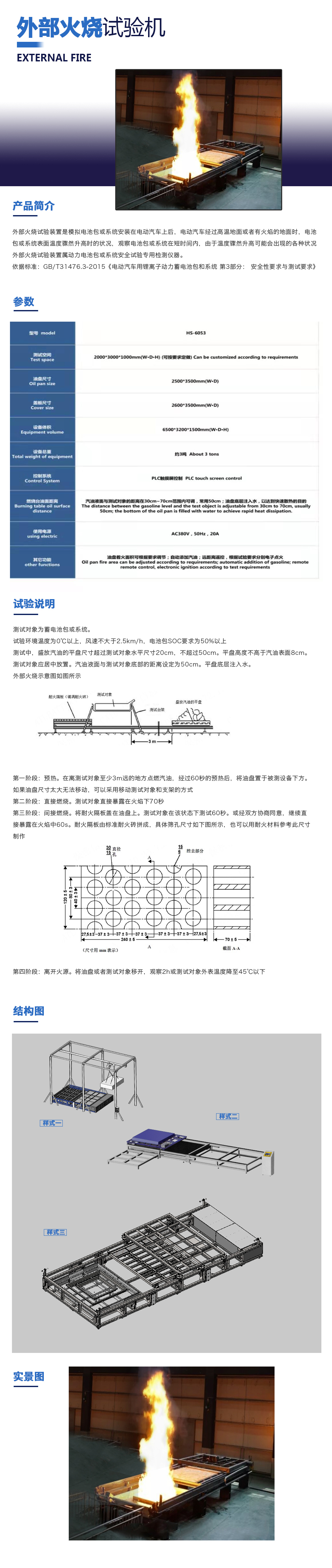 用途:外部火燒試驗(yàn)裝置是模擬電池包或系統(tǒng)安裝在電動汽車上后,電動汽車經(jīng)過高溫地面或者有火焰的地面時,電池包或系統(tǒng)表面溫度驟然升高時的狀況,觀察電池包或系統(tǒng)在短時間內(nèi),由