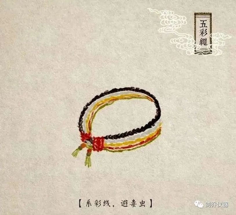 五彩繩,又稱五彩絲、五色絲等,是端午節吉祥物兼飾物,具有辟邪作用,兼有祈福納吉的美好寓意。五彩繩源于我國古代的五行觀念,由古代文身之俗演變而來。