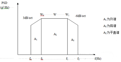 為了簡便起見,往往將功率譜密度曲線圖劃分成若干矩形和三角形,并利用上升斜率(如3dB/oct)和下降斜率(如-6dB/oct)分別算出wa 和w2,然后求各個幾何形狀的面積與面積和,再開方求出加速度總均方根值。